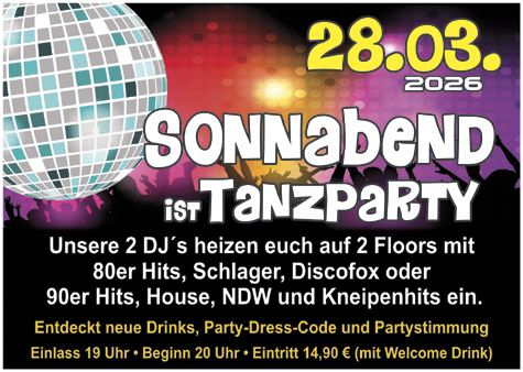 28.03.2026 - Unsere 2 DJ's heizen euch auf 2 Floors mit 80iger Hits, Schlager, Discofox oder 90iger Hits, House, NDW und Kneipenhits ein.