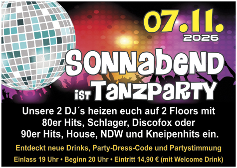 07.11.2026 - Unsere 2 DJ's heizen euch auf 2 Floors mit 80iger Hits, Schlager, Discofox oder 90iger Hits, House, NDW und Kneipenhits ein.